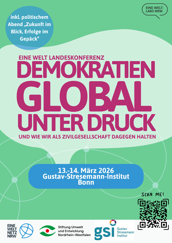 Um diesen Entwicklungen gemeinsam zu begegnen, laden das Eine Welt Netz NRW und die Stiftung Umwelt und Entwicklung Nordrhein-Westfalen am 13. und 14. März zur Eine Welt Landeskonferenz 2026 in das Gustav Stresemann Institut nach Bonn ein.