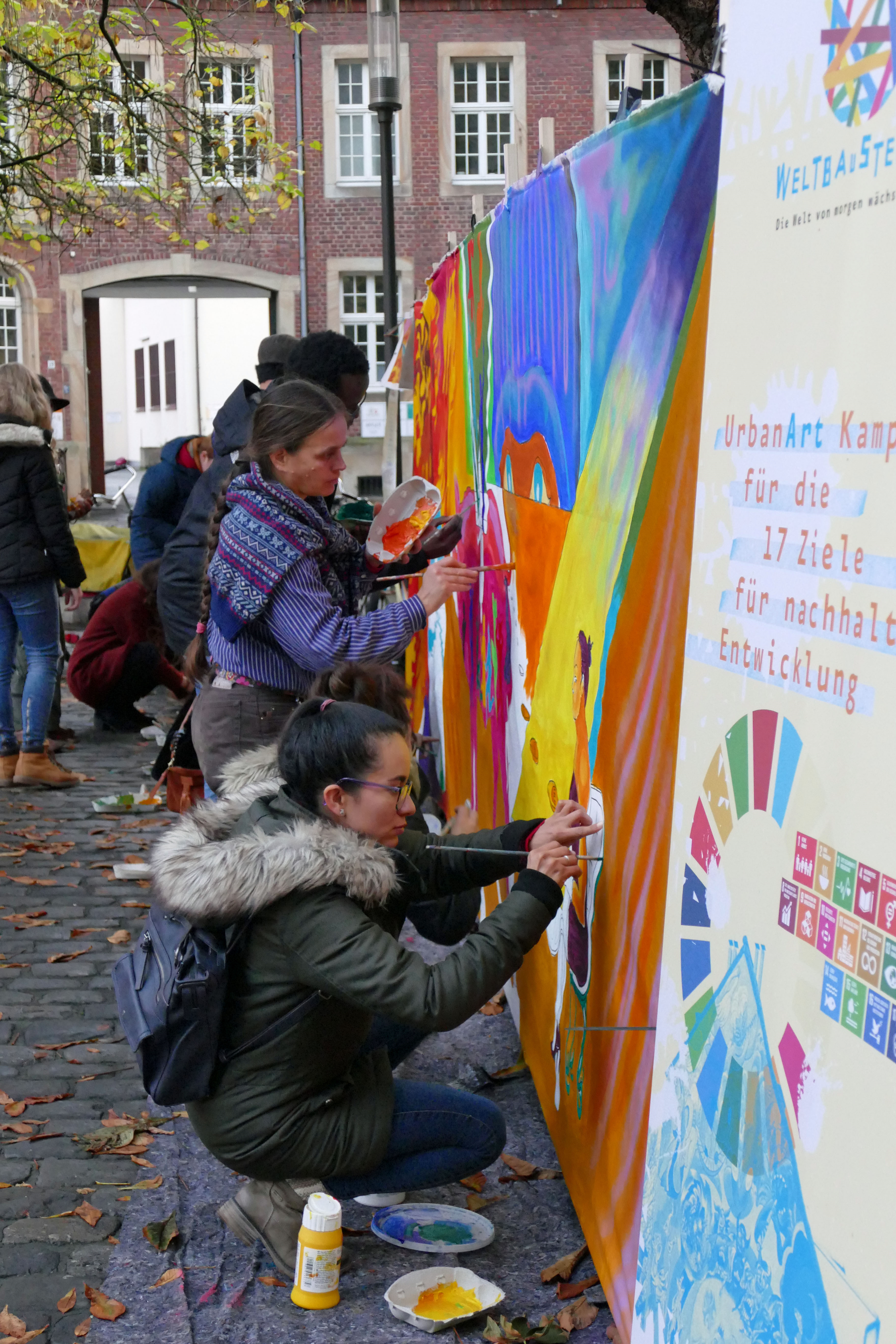 Bildunterschrift: Mit großen Fassadenbildern und Aktionen hat die Kampagne Weltbaustellen des „Eine Welt Netz NRW e.V.“ in vielen Städten von Nordrhein-Westfalen die Ziele nachhaltiger Entwicklung sichtbar gemacht.
