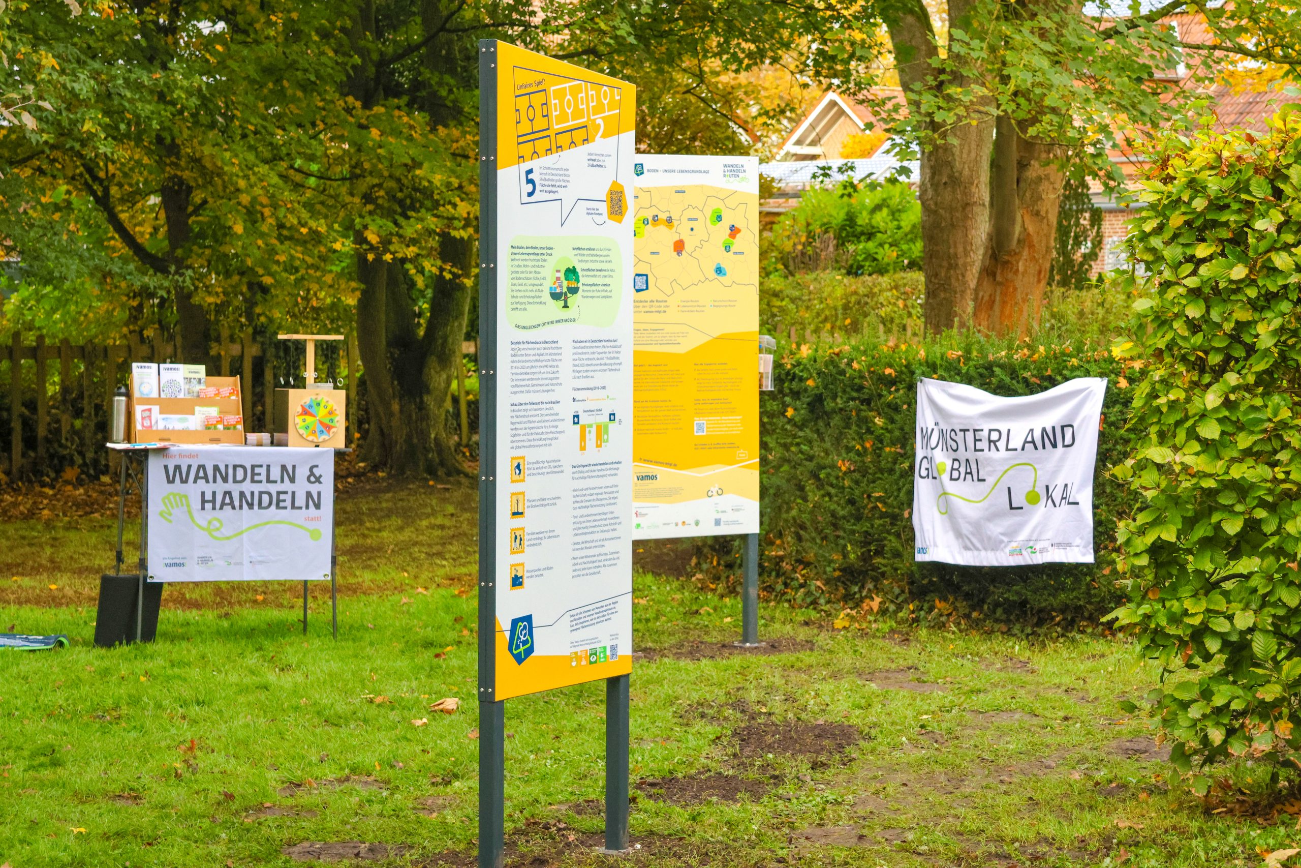 Auf den Wandeln & Handeln Radrouten quer durchs Münsterland sind zwei neue Mitmachstationen eröffnet worden, die sich aktuellen gesellschaftlichen Themen widmen. Die Station „Flächenkonkurrenz – unsere Lebensgrundlage unter Druck“ greift die Frage auf, wie wir mit den begrenzten Flächen auf unserem Planeten sinnvoller umgehen können. Die Station „Frieden, Gerechtigkeit und globales Miteinander“ widmet sich dem Thema des Zusammenlebens in einer diversen Stadt- und Weltgesellschaft. Die zugehörigen Radrouten greifen durch Stopps an Orten des Wandelns im Münsterland die Themen der Stationen auf und zeigen Menschen, Vereine und Unternehmen, die sich für mehr Gemeinwohl, Menschenrechte und Nachhaltigkeit einsetzen.
